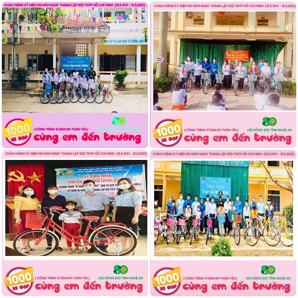 Tính đến nay, toàn tỉnh đã thực hiện trao tặng 912 xe đạp cho các em học sinh có hoàn cảnh khó khăn đang học tập tại các liên đội trên địa bàn toàn tỉnh với trị giá mỗi chiếc xe từ 1-2 triệu đồng, tiêu biểu như các đơn vị: Kỳ Sơn, Đô Lương, Anh Sơn, Thanh Chương, Diễn Châu, Nghi Lộc, Con Cuông… Công trình sẽ tiếp tục được tiếp tục triển khai đến hết ngày 15/5/2021.