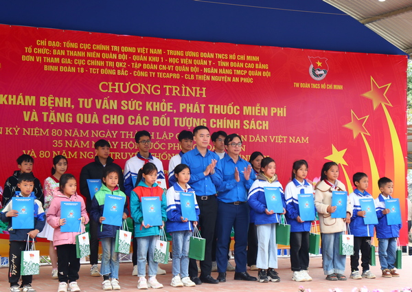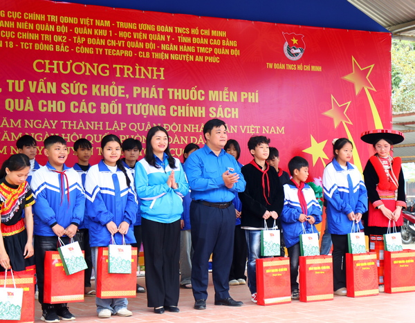 Đồng chí Nguyễn Thái An, Trưởng ban Tuyên giáo Trung ương Đoàn và đồng chí Triệu Thanh Dung, Bí thư Tỉnh đoàn Cao Bằng trao quà cho các em học sinh nghèo có hoàn cảnh khó khăn.