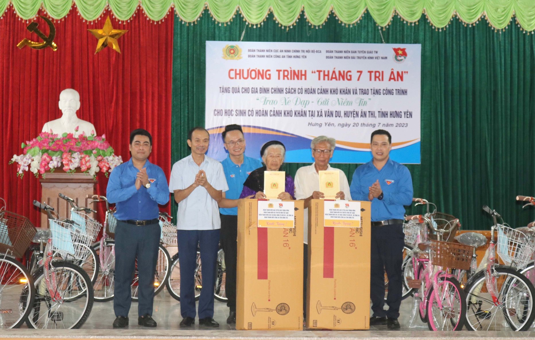 Đoàn Thanh niên các đơn vị đã đến dâng hương, dâng hoa tưởng niệm các Anh hùng liệt sĩ tại Nghĩa trang liệt sĩ xã Vân Du, huyện Ân Thi, tỉnh Hương Yên; dâng hương tưởng nhớ Anh hùng liệt sĩ Công an nhân dân Bùi Thị Cúc; tặng quà cho Mẹ Việt Nam Anh hùng Đặng Thị Nhường. Đồng thời, Đoàn đã trao tặng 20 chiếc xe đạp cho con em các gia đình thương binh liệt sĩ trên địa bàn xã Vân Du…