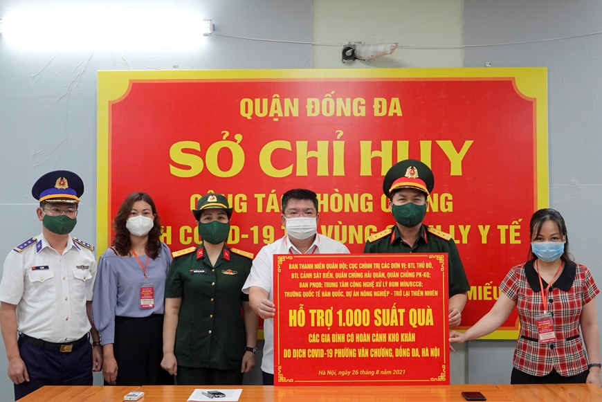 Lãnh đạo Ban Thanh niên Quân đội và đại diện các đơn vị trao quà tặng các đình có hoàn cảnh khó khăn do dịch Covid-19, thông qua lực lượng chức năng.