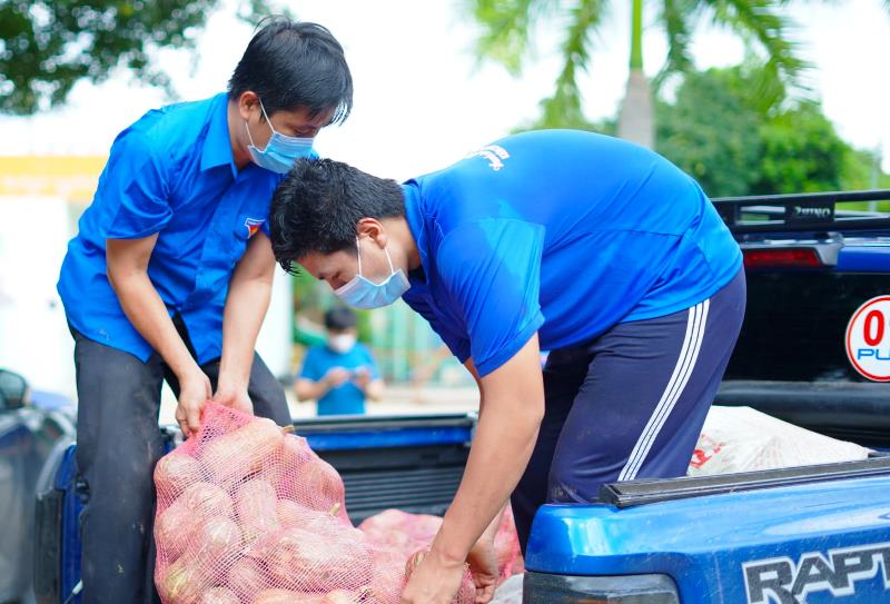 Nông sản do tuổi trẻ Bình Phước gửi tặng được khuân xuống xe để chuyển ngay đến các hộ gia đình gặp khó trong mùa dịch