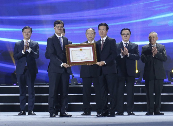 Ủy viên Bộ Chính trị, Bí thư T.Ư Đảng, Trưởng Ban Tuyên giáo T.Ư Võ Văn Thưởng (bên phải) trao tặng Huân chương Độc lập hạng Nhất cho Hội Sinh viên Việt Nam.
