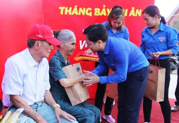 Anh Nguyễn Anh Tuấn, Bí thư thứ nhất Trung ương Đoàn, Chủ tịch Trung ương Hội LHTN Việt Nam tặng quà cho các bác là cựu tù Côn Đảo tại chặng thứ ba với chủ đề "Tháng Bảy tri ân"