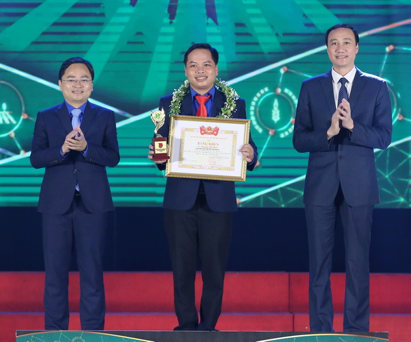 Đồng chí Phùng Khánh Tài, Phó Chủ tịch Trung ương Mặt trận Tổ quốc Việt Nam; đồng chí Nguyễn Anh Tuấn, Bí thư Thứ nhất TƯ Đoàn, Chủ tịch Hội LHTN Việt Nam(bìa trái) trao giải thưởng Lương Định Của cho các nhà nông trẻ xuất sắc