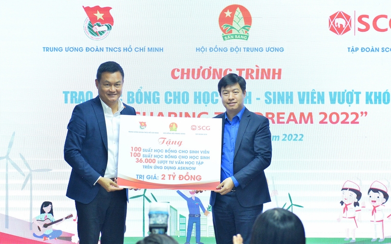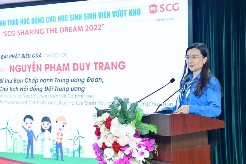 Đồng chí Nguyễn Phạm Duy Trang khẳng định, Chương trình trao học bổng "SCG Sharing The Dream 2022" là sự khẳng định cam kết không ngừng của Hội đồng Đội Trung ương và SCG trong việc tiếp sức thế hệ trẻ hiện thực hóa “giấc mơ lớn” cho tương lai bền vững của đất nước.