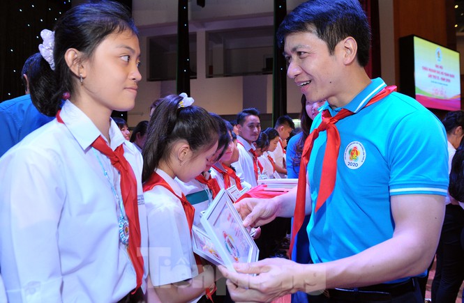 Đồng chí Bùi Quang Huy - Bí thư T.Ư Đoàn, Chủ tịch T.Ư Hội Sinh viên Việt Nam trao chứng nhận Cháu ngoan Bác Hồ toàn quốc cho các đại biểu. (Ảnh: Xuân Tùng - TP)