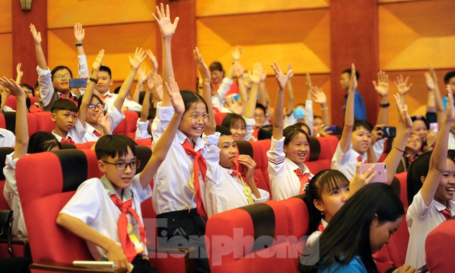 Các đại biểu thiếu nhi sôi nổi giao lưu với NSƯT Xuân Bắc (Ảnh: Xuân Tùng - TP).