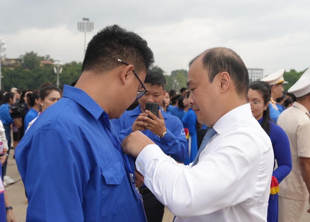 Đồng chí Lê Hải Bình - Uỷ viên dự khuyết T.Ư Đảng, Phó trưởng Ban Tuyên giáo T.Ư trao Huy hiệu Thanh niên tiên tiến làm theo lời Bác cho đại biểu thanh niên