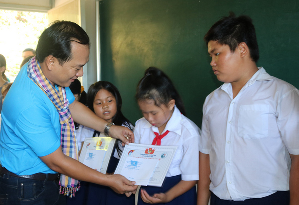 Anh Nguyễn Chí Công – Chủ tịch Hội LHTN Việt Nam tỉnh Cà Mau trao học bổng cho các em học sinh của Lớp học tình thương trên đảo