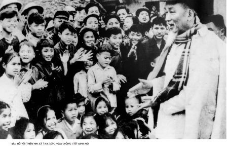 Chủ tịch Hồ Chí Minh nói chuyện với thiếu nhi Tam Sơn, tại sân Trường THCS Tam Sơn ngày mồng 1 tết Đinh Mùi (9-02-1967). Ảnh: TTXVN