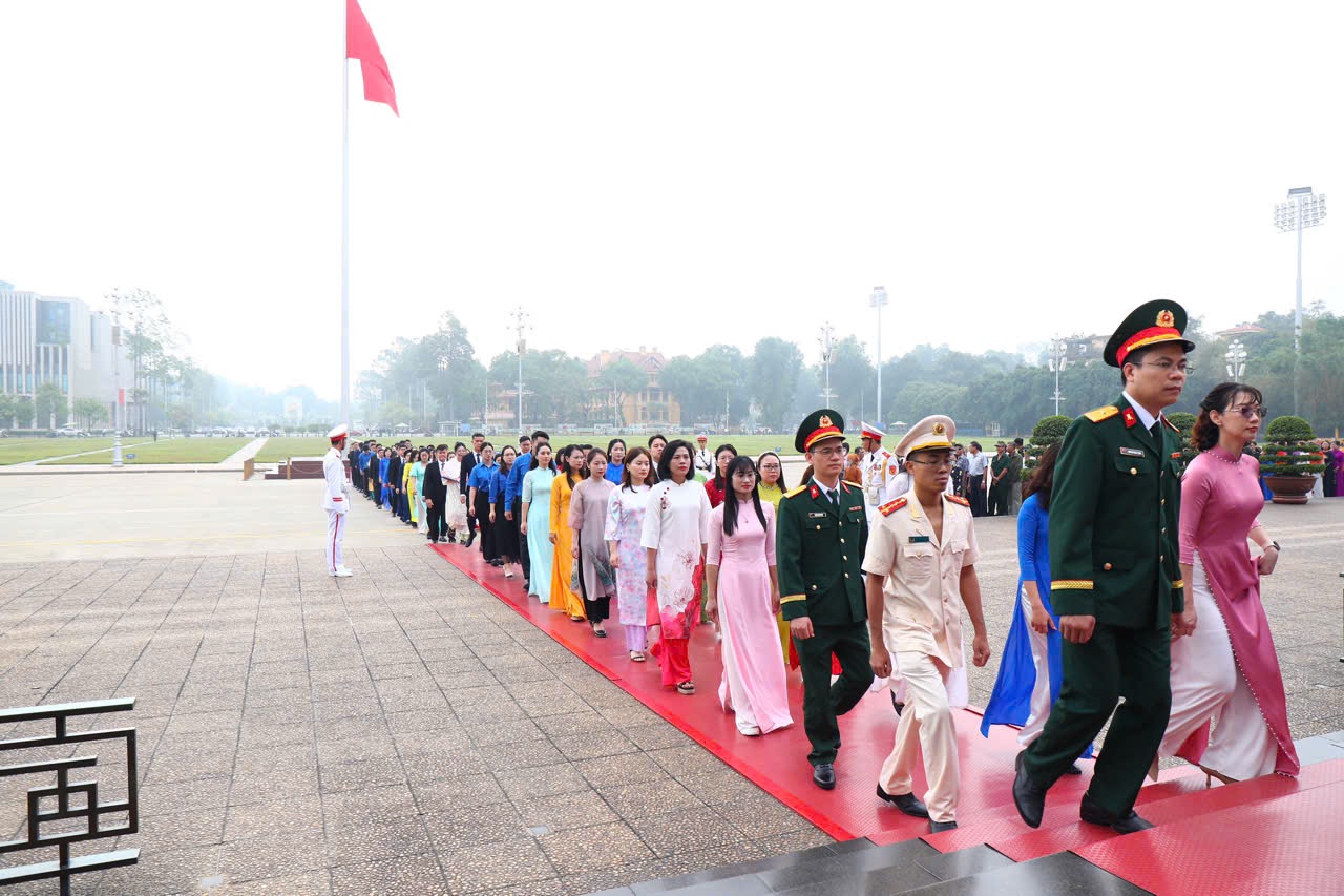 Tại quảng trường Ba Đình lịch sử, Đoàn đại biểu đã thành kính dâng lên Người những bông hoa tươi thắm nhất để bày tỏ lòng biết ơn vô hạn đến công lao to lớn của Chủ tịch Hồ Chí Minh đối với sự nghiệp cách mạng của Đảng và dân tộc, dẫn dắt Đảng ta, nhân dân ta làm nên những thắng lợi vẻ vang.