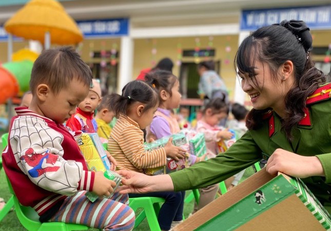 Tuổi trẻ công an xã Xuân Nội, huyện Trùng Khánh, tỉnh Cao Bằng vừa kết nối, trao tặng nhiều vật phẩm thiết thực cho các em học sinh, giáo viên trường mầm non tại xã biên giới đặc biệt khó khăn.