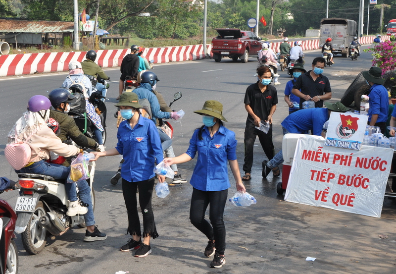 Các bạn đoàn viên thanh niên trao những chai nước suối, khăn lạnh, khẩu trang đến những người về quê