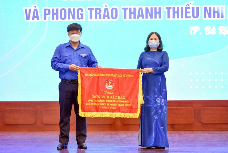 Đồng chí Nguyễn Thị Yến, Phó Bí thư Thường trực Tỉnh ủy, Trưởng Đoàn ĐBQH tỉnh trao Cờ thi đua của Trung ương Đoàn cho Đoàn Tổng Công ty Bảo đảm an toàn Hàng hải miền Nam.