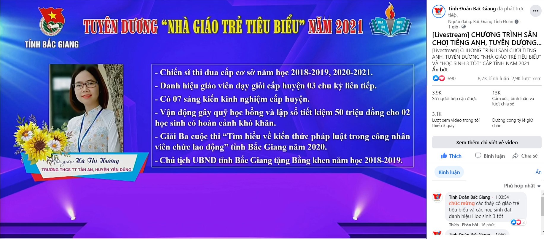 ĐTN: Tỉnh đoàn Bắc Giang tổ chức Tuyên dương “Nhà giáo trẻ tiêu biểu”, “Học sinh 3 tốt” cấp tỉnh và Sân chơi tiếng Anh trực tuyến phát livestream trên Fanpage “Tỉnh đoàn Bắc Giang”.