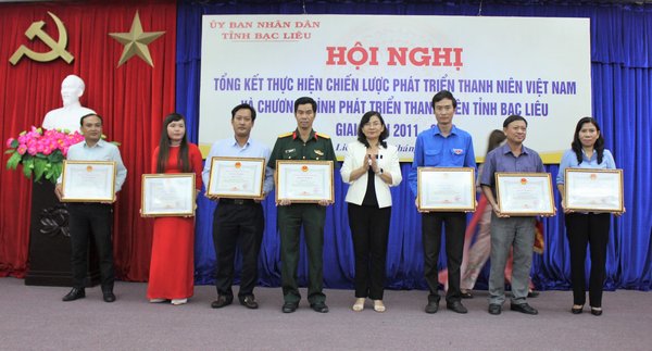 Đồng chí Lâm Thị Sang - n, Phó Chủ tịch UBND tỉnh trao bằng khen cho các cá nhân có thành tích xuất sắc trong thực hiện CLPT TN VN và Chương trình phát triển thanh niên tỉnh Bạc Liêu giai đoạn 2011 - 2020