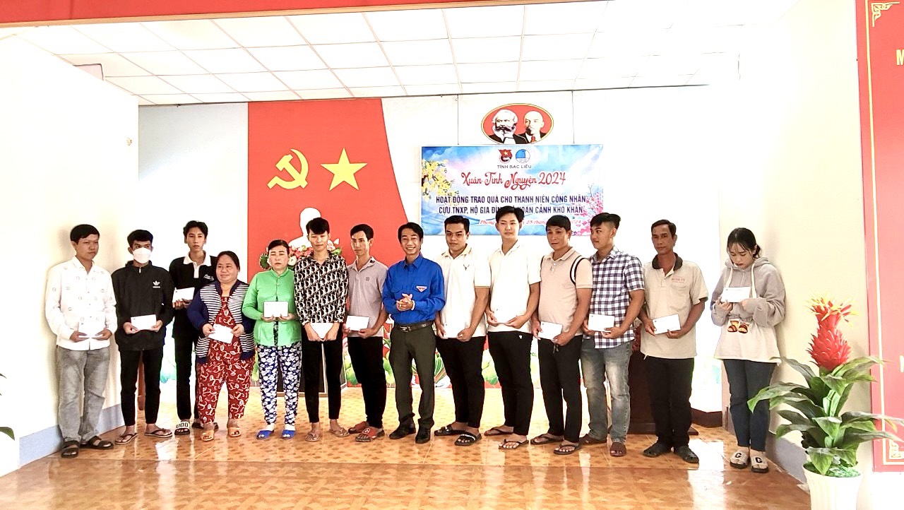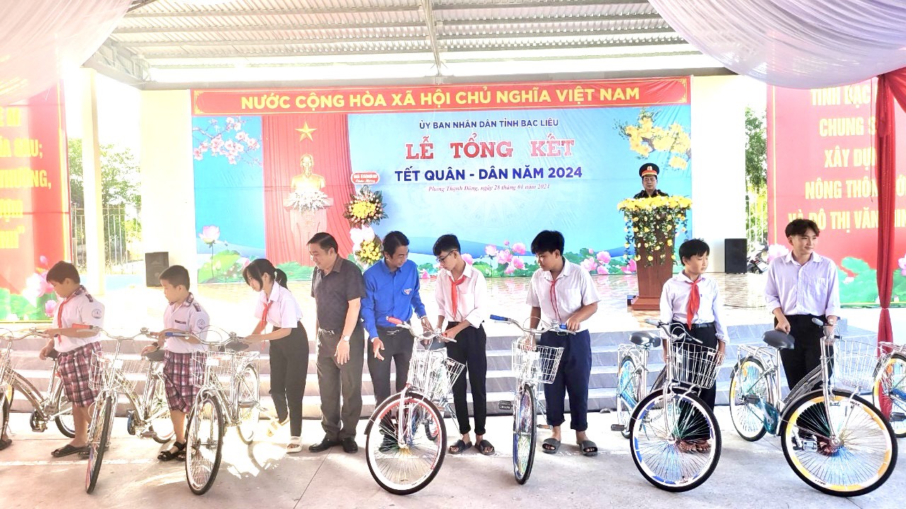 Cùng ngày, Đoàn công tác của Tỉnh đoàn đã đến trao tặng 05 chiếc xe đạp và 05 suất học bổng cho các em thiếu nhi nhân lễ tổng kết Tết Quân - Dân năm 2024 diễn ra tại xã Phong Thạnh Đông, thị xã Giá Rai.