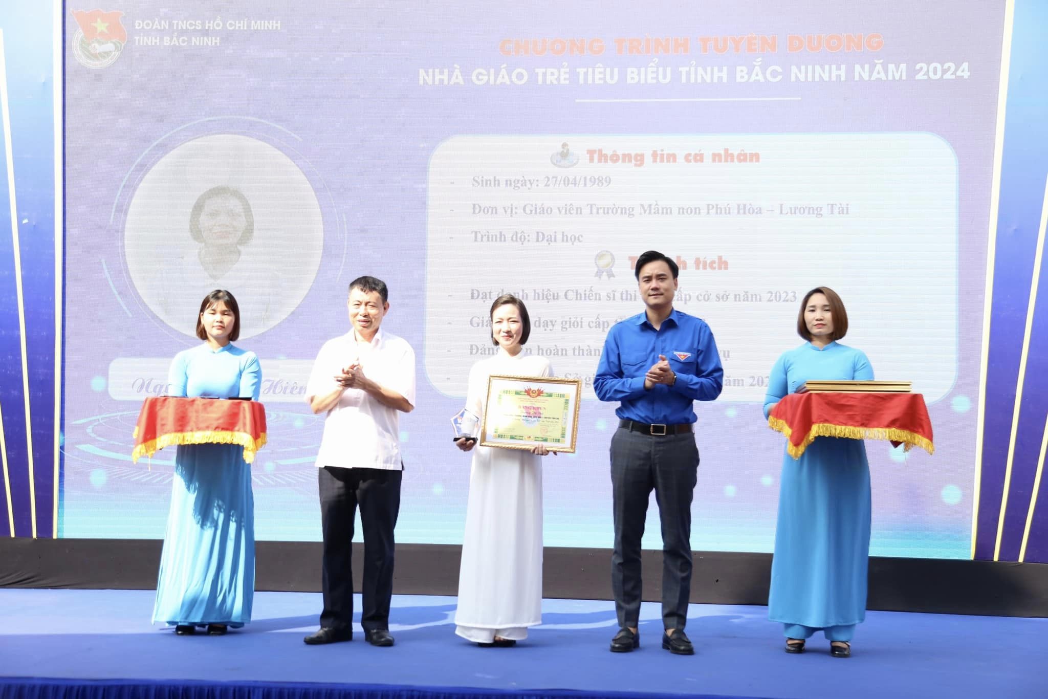 Ghi nhận những cống hiến của các nhà giáo trẻ, Ban Thường vụ Tỉnh Đoàn tặng Bằng khen và biểu trưng cho 40 thầy cô giáo đạt danh hiệu “Nhà giáo trẻ tiêu biểu cấp tỉnh” năm 2024. Đây là danh hiệu được trao cho các thầy cô giáo không quá 35 tuổi có nhiều cống hiến cho sự nghiệp giáo dục, có thành tích xuất sắc trong công tác Đoàn - Hội – Đội tỉnh Bắc Ninh.