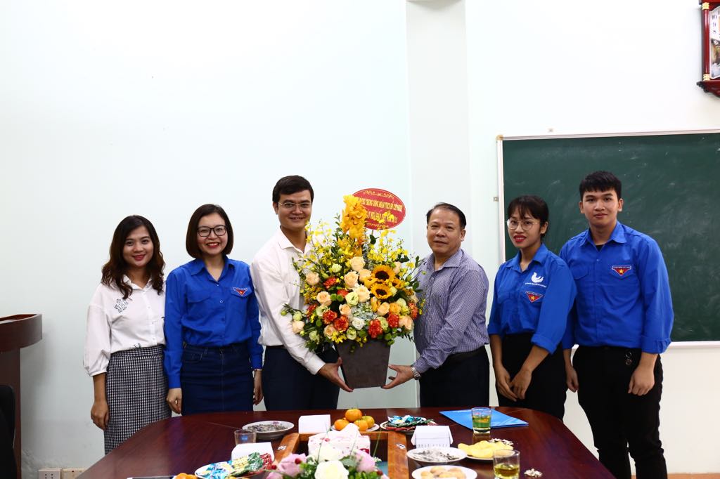 Đồng chí Bùi Quang Huy, Bí thư Trung ương Đoàn, Chủ tịch Hội Sinh viên Việt Nam cùng đoàn công tác tặng hoa chúc mừng thầy Trần Văn Phòng