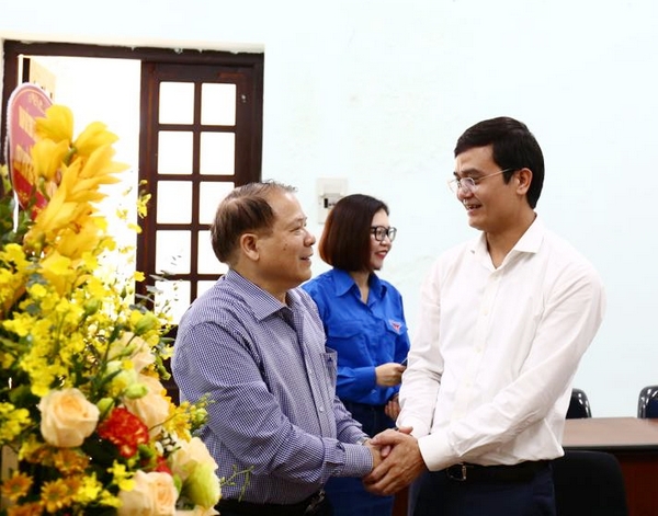 Đồng chí Bùi Quang Huy, Bí thư Trung ương Đoàn, Chủ tịch Hội Sinh viên Việt Nam chúc mừng thầy Trần Văn Phòng