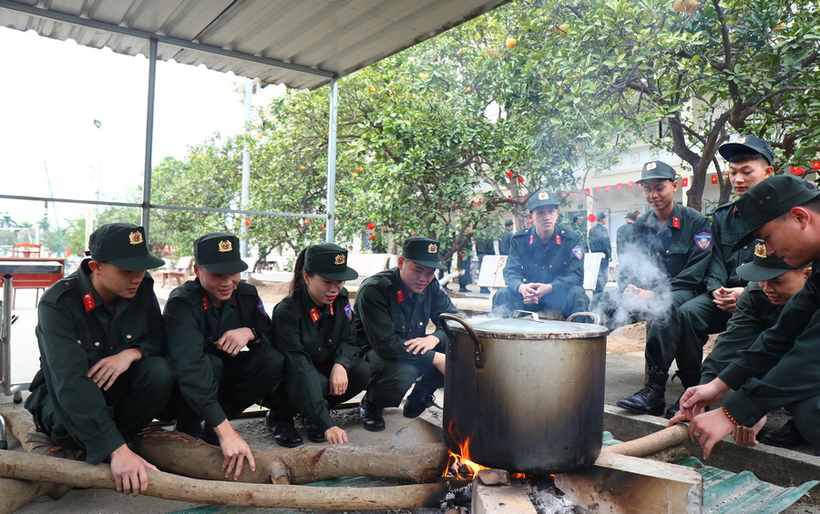Cán bộ, chiến sĩ Đoàn Cảnh sát Đặc nhiệm số 1 cùng nhau gói bánh chưng để đón Tết ngay tại đơn vị.