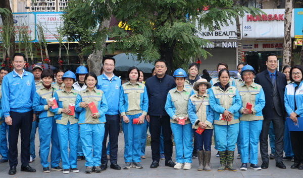 Đồng chí Nguyễn Tường Lâm thăm, chúc Tết đội công nhân thuộc Công ty TNHH MTV Môi trường Đô thị quận Long Biên tại Vườn hoa phố Ngọc Lâm (Hà Nội)
