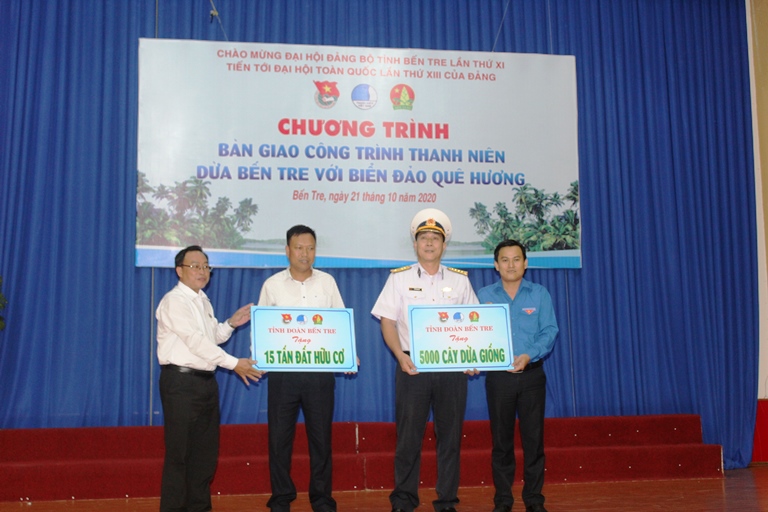 Đây là năm thứ tư Ban Thường vụ Tỉnh đoàn tổ chức thực hiện công trình thanh niên “Dừa Bến Tre với biển, đảo quê hương”. Tiếp nối ý nghĩa, thành công từ các công trình trước đó, tại chương trình năm nay, Ban Thường vụ Tỉnh đoàn đã trao 5.000 cây dừa giống, 15 tấn đất hữu cơ góp phần phủ xanh quần đảo Trường Sa và bán đảo Cam Ranh.