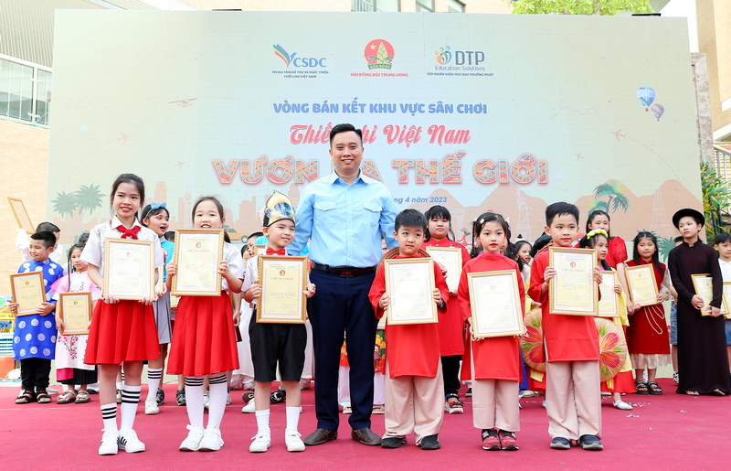 Phó Chủ tịch Hội đồng Đội Trung ương Lê Anh Quân trao giải Nhất vòng bán kết cho 02 đội.