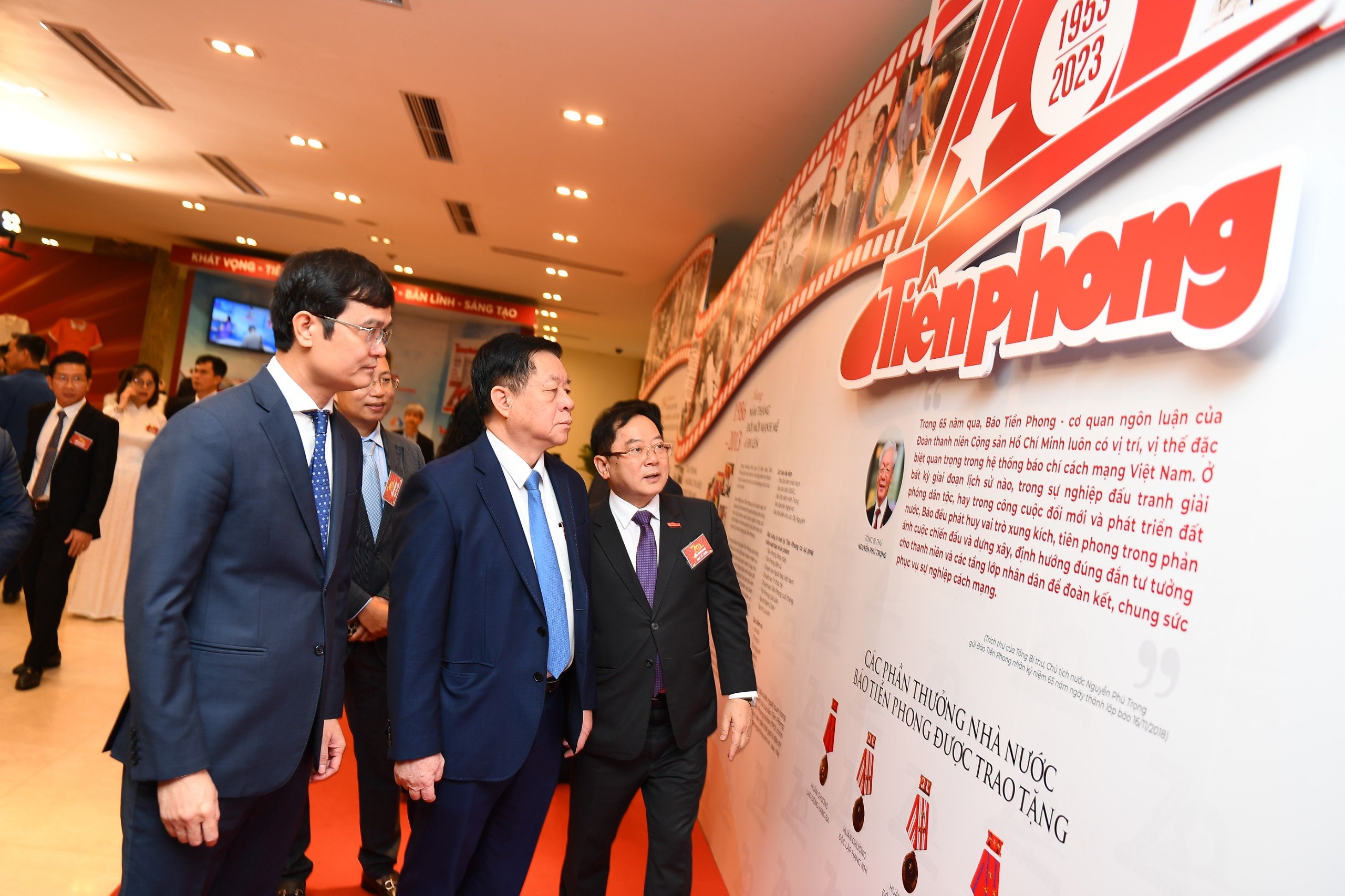Bí thư Trung ương Đảng, Trưởng ban Tuyên giáo Trung ương Nguyễn Trọng Nghĩa và Ủy viên dự khuyết Trung ương Đảng, Bí thư thứ nhất Trung ương Đoàn Bùi Quang Huy tham quan "Bức tường lịch sử" báo Tiền Phong.