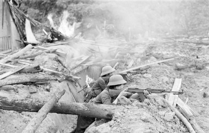 Các nữ chiến sỹ tự vệ Lâm trường Bản Phiệt, huyện Mường Khương, tỉnh Hoàng Liên Sơn (nay thuộc tỉnh Lào Cai) bám trụ chiến đấu, phối hợp với bộ đội địa phương đánh lui nhiều đợt tấn công của địch. (Ảnh: Nguyễn Trân/TTXVN)