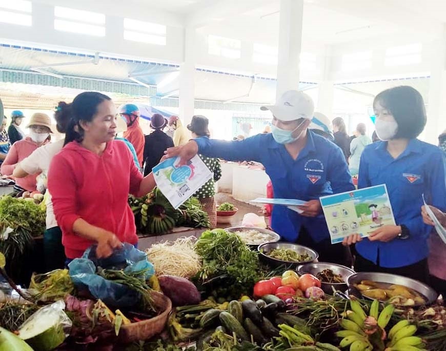 Phát tờ rơi hướng dẫn người dân phòng chống dịch bệnh Covid-19 tại chợ Đại Cường (Đại Lộc)