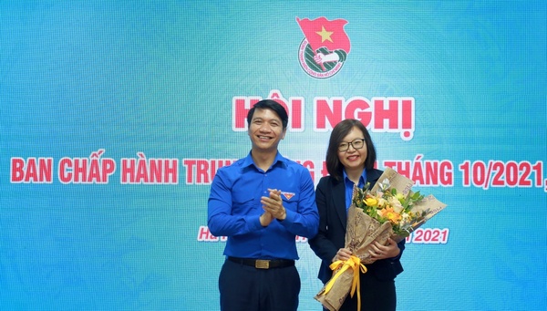 Đồng chí Nguyễn Ngọc Lương, Bí thư TƯ Đoàn, Chủ tịch Hội LHTN Việt Nam tặng hoa chúc mừng đồng chí Vũ Thị Tuyết Mai được bầu vào Ủy viên Hội đồng Đội Trung ương