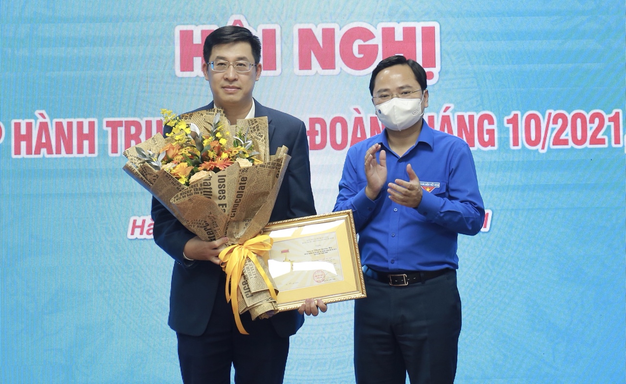 Đồng chí Bùi Quang Huy, Ủy viên dự khuyết BCH TƯ Đảng, Bí thư Thường trực Trung ương Đoàn tặng hoa chúc mừng đồng chí Ngô Văn Cương, Bí thư TƯ Đoàn được bầu giữ chức Chủ nhiệm Ủy ban Kiểm tra Trung ương Đoàn và 02 đồng chí vào Ủy ban Kiểm tra T.Ư Đoàn.