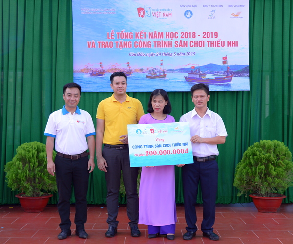 Đ/c Nguyễn Thiên Tú – Phó Ban Thanh niên Trường học Trung ương Đoàn cùng đại diện Đoàn Tổng công ty Bưu điện Việt Nam trao tặng công trình sân chơi cho Ban giám hiệu trường tiểu học Cao Văn Ngọc