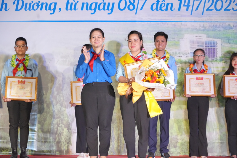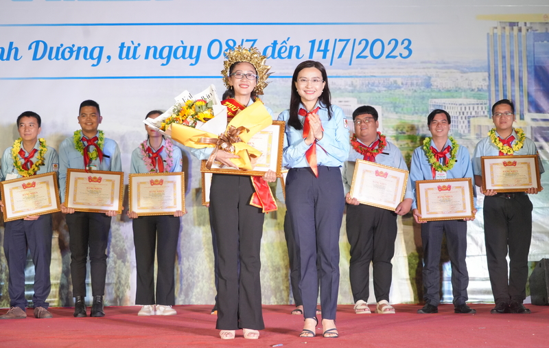 Đồng chí Trần Thị Diễm Trinh - Bí thư Tỉnh Đoàn, Chủ tịch Hội Sinh viên Việt Nam tỉnh Bình Dương trao danh hiệu Á khoa II