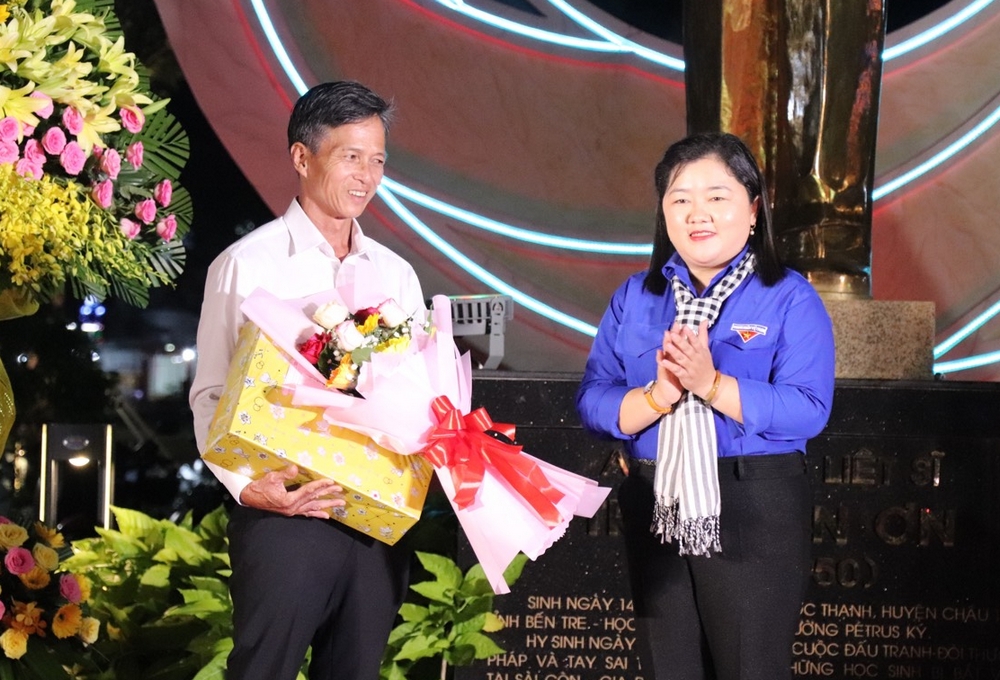 Trong không khí trang nghiêm, xúc động, Thường trực Tỉnh đoàn Bến Tre đã tặng hoa và quà lưu niệm cho đại diện gia đình Anh hùng lực lượng vũ trang Nhân dân - Liệt sĩ Trần Văn Ơn. Đại biểu tham dự chương trình đã thực hiện nghi thức khởi động năm mới 2024 với chủ đề “Năm Thanh niên tình nguyện”.