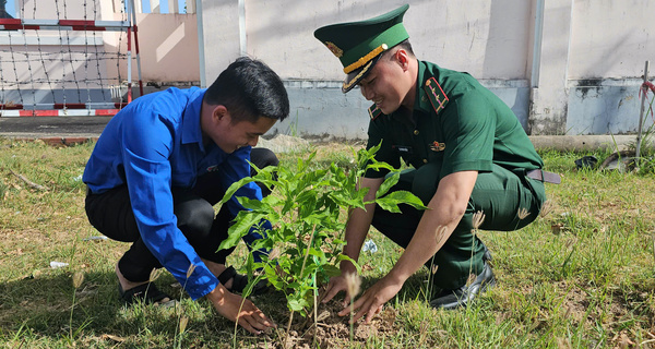 Đoàn viên thanh niên cùng các chiến sĩ Đồn Biên phòng Cổ Chiên thực hiện công trình thanh niên “Sắc xanh xứ dừa”