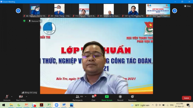 Lớp bồi dưỡng diễn ra trong 03 ngày (từ ngày 30/10 - 01/11/2021) với hình thức trực tuyến qua phần mềm Zoom. Các báo cáo viên được mời từ Phân viện Miền Nam, Ban Tôn giáo tỉnh Bến Tre đã có nhiều kinh nghiệm trong công tác, khả năng sư phạm và truyền lửa nhiệt huyết cho cán bộ Đoàn.