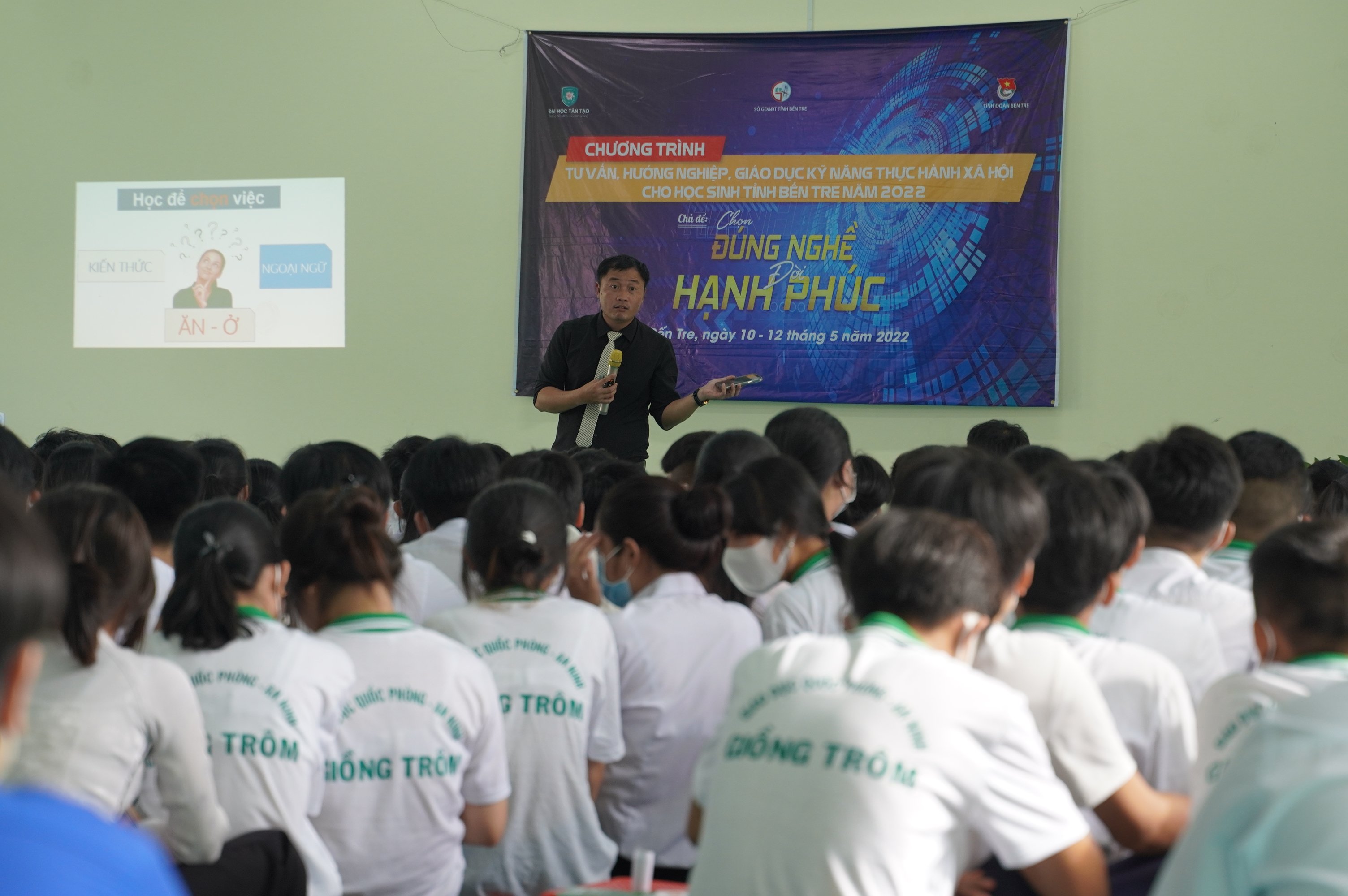 Chương trình tư vấn hướng nghiệp, giáo dục kỹ năng thực hành xã hội cho học sinh tỉnh Bến Tre năm 2022 với chủ đề “Chọn đúng nghề - Đời hạnh phúc” với sự hỗ trợ của Đại học Tân Tạo diễn ra từ ngày 10/5 đến ngày 12/5/2022, thời gian thực hiện hướng nghiệp tại mỗi trường từ 60 phút đến 90 phút cho học sinh, phụ huynh thuộc 09 trường THPT và Trung tâm GDNN-GDTX trên địa bàn tỉnh. Chương trình mang đến những kiến thức về kỹ năng thực hành xã hội và vấn đề chọn ngành, chọn nghề trong tương lai, cũng như mang đến những thông tin về hệ thống đào tạo từ trung cấp đến đại học, hệ thống đào tạo liên thông, chương trình giáo dục quốc tế; dự báo nguồn nhân lực, thị trường lao động; khám phá năng lực bản thân; tâm lý, sức khỏe, dinh dưỡng mùa thi; chiến lược, bí quyết học tập và thi hiệu quả.