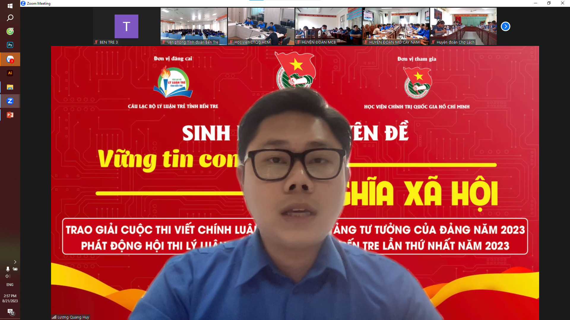 ĐTN: Ngày 21/8/2023, tại Trường Chính trị Tỉnh, Ban Thường vụ Tỉnh đoàn Bến Tre tổ chức Sinh hoạt chuyên đề “Vững tin con đường chủ nghĩa xã hội”(CNXH), chương trình do CLB Lý luận trẻ tỉnh Bến Tre phối hợp với Đoàn Học viện Chính trị Quốc gia Hồ Chí Minh đăng cai tổ chức với hình thức trực tiếp kết hợp trực tuyến.