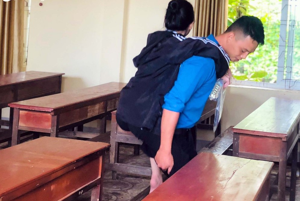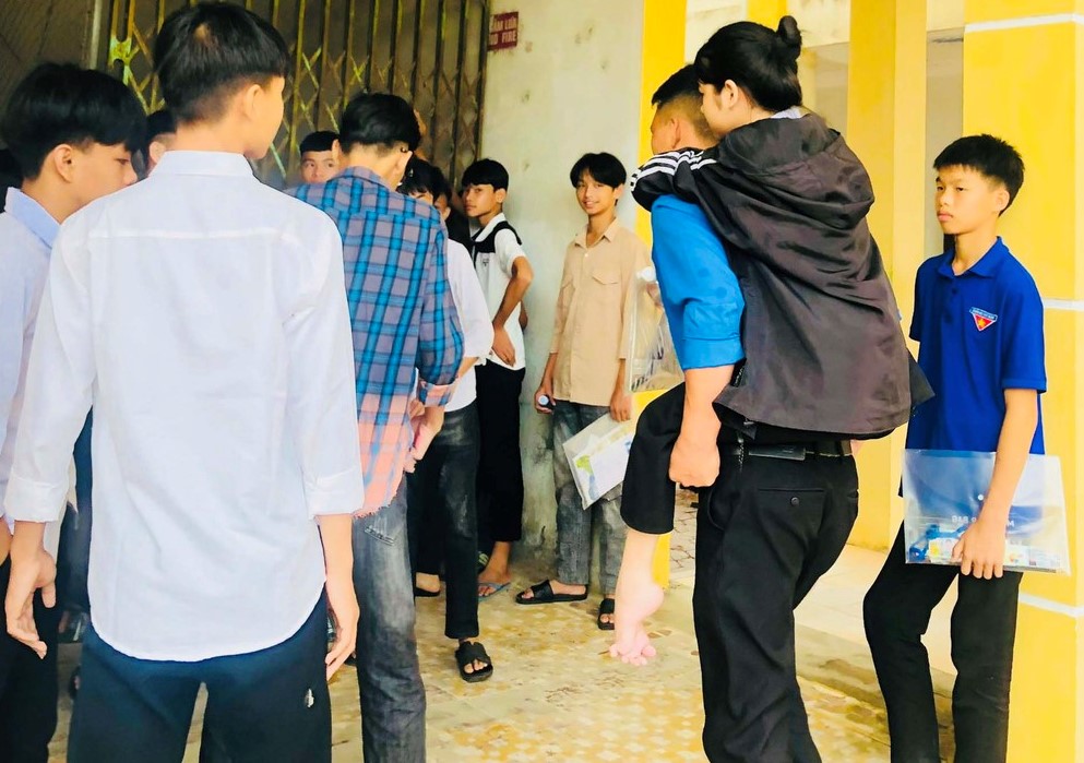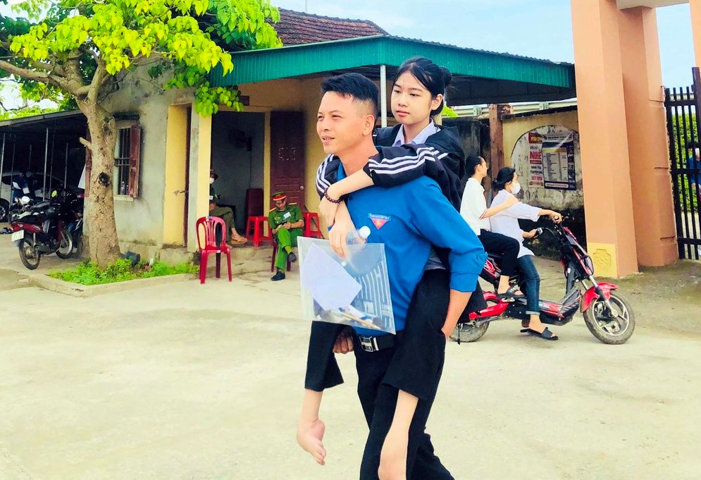 Anh Nguyễn Văn Hoàng - Bí thư Đoàn xã Võ Liệt hỗ trợ thí sinh bị xương thủy tinh đến điểm thi trong sáng nay. Ảnh: Huyện đoàn Thanh Chương