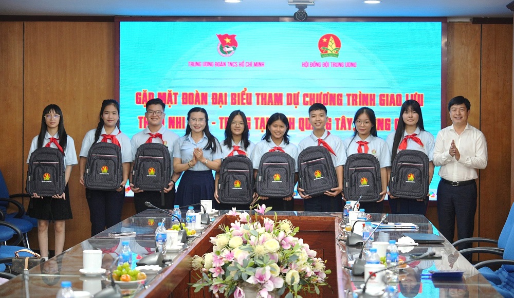 Bí thư T.Ư Đoàn, Chủ tịch Hội đồng Đội Trung ương Nguyễn Phạm Duy Trang và đồng chí Lê Hải Long- UV BTV, Trưởng Ban Công tác thiếu nhi T.Ư Đoàn, Phó chủ tịch thường trực Hội đồng Đội Trung ương tặng quà cho các em thiếu nhi trước khi lên đường tham dự chương trình giao lưu thiếu nhi Việt - Trung