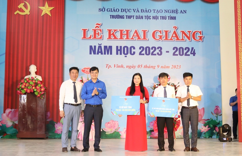 T.Ư Đoàn trao tặng 01 mô hình điện năng lượng mặt trời và 10 máy tính với tổng trị giá 200 triệu đồng cho nhà trường THPT Dân tộc Nội trú Nghệ An