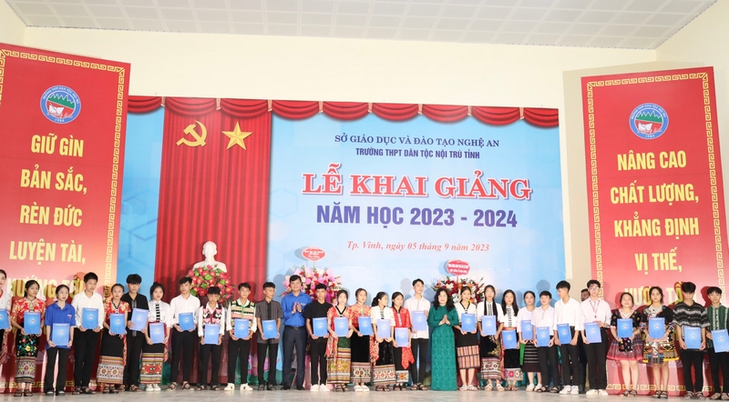 Phát biểu tại lễ khai giảng, cô giáo Nguyễn Thị Kiều Hoa - Hiệu trưởng trường THPT Dân tộc Nội trú Nghệ An (TP. Vinh, Nghệ An) cho biết, năm 2023 - 2024, trường 82 cán bộ, giáo viên và 700 học sinh của 3 khối, trong đó có 278 em học sinh lớp 10 mới nhập học.