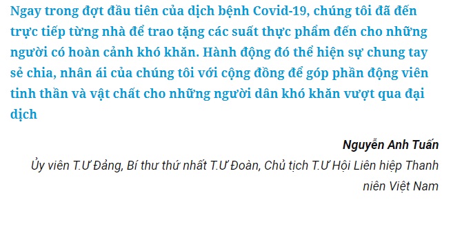 Là thủ lĩnh của thanh niên, đồng chí Nguyễn Anh Tuấn, Ủy viên T.Ư Đảng, Bí thư thứ nhất T.Ư Đoàn, Chủ tịch T.Ư Hội Liên hiệp thanh niên Việt Nam, không chỉ chăm lo cho thanh niên mà luôn quan tâm đến cuộc sống của người dân khi mà dịch Covid-19 đang hoành hành.