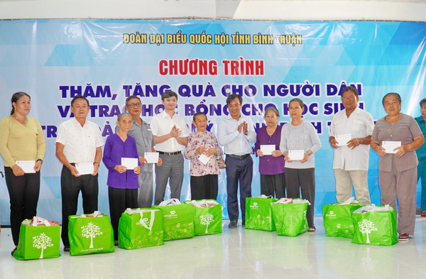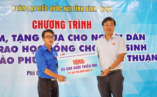 Cụ thể, đoàn đã thăm và tặng quà 29 gia đình chính sách; tặng 20 bồn chứa nước 1.000 lít cho 20 gia đình hộ nghèo; tặng 30 suất học bổng cho các em học sinh vượt khó học giỏi (trị giá 30 triệu đồng); tặng 30 đèn năng lượng mặt trời để làm tuyến đường ánh sáng an ninh nối dẫn đến Cột cờ chủ quyền Tổ quốc trên đảo Phú Quý (trị giá 30 triệu đồng); tặng 03 sân chơi thiếu nhi tại điểm trường Đông Hải của trường Mầm non Long Hải, Trung tâm Văn hóa - Thể thao xã Tam Thanh, Công viên xã Ngũ Phụng (tổng giá trị 90 triệu đồng); tặng 6.000 "bữa cơm" thuộc chương trình "San sẻ yêu thương, chung tay vượt qua đại dịch" cho các gia đình khó khăn (tổng giá trị 100 triệu đồng); thăm và tặng đèn năng lượng mặt trời tại 02 chốt trực quân sự trên đảo Phú Quý.