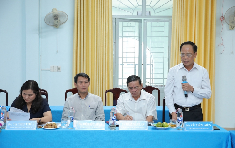 Các Ủy viên Ban Thường vụ Tỉnh ủy: Lê Thị Xuân Trang, Trưởng ban Dân vận, Chủ tịch Ủy ban MTTQ Việt Nam tỉnh; Vũ Tiến Điền, Trưởng ban Tuyên giáo Tỉnh ủy; đại diện lãnh đạo các sở, ban, ngành của tỉnh cùng dự buổi làm việc.