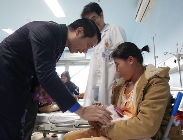 Gặp gỡ các em nhỏ đang điều trị nội trú tại Khoa Ngoại của bệnh viện, Bí thư T.Ư Đoàn, Chủ tịch Hội đồng Đội Trung ương Nguyễn Ngọc Lương ân cần thăm hỏi người nhà về sức khỏe, bệnh tình của mỗi bệnh nhân.