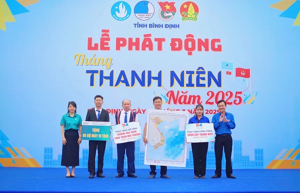 Tỉnh đoàn trao bảng tượng trưng, tặng công trình Vườn cây thanh niên, mô hình “Trường học xanh - Thân thiện môi trường”, Bản đồ Việt Nam và 5 bộ máy tính cho đại diện cho Trường THCS bán trú Canh Thuận và Xã đoàn Canh Thuận.