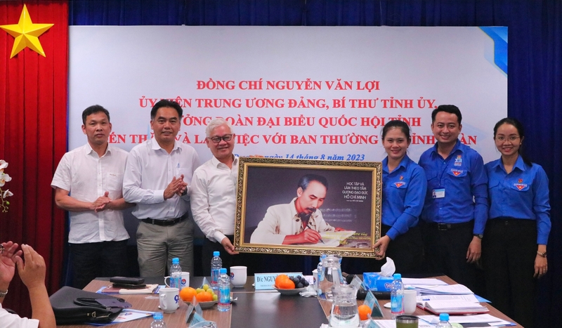 Bí thư Tỉnh ủy Nguyễn Văn Lợi trao tặng bức ảnh Bác Hồ cho Ban Thường vụ Tỉnh đoàn